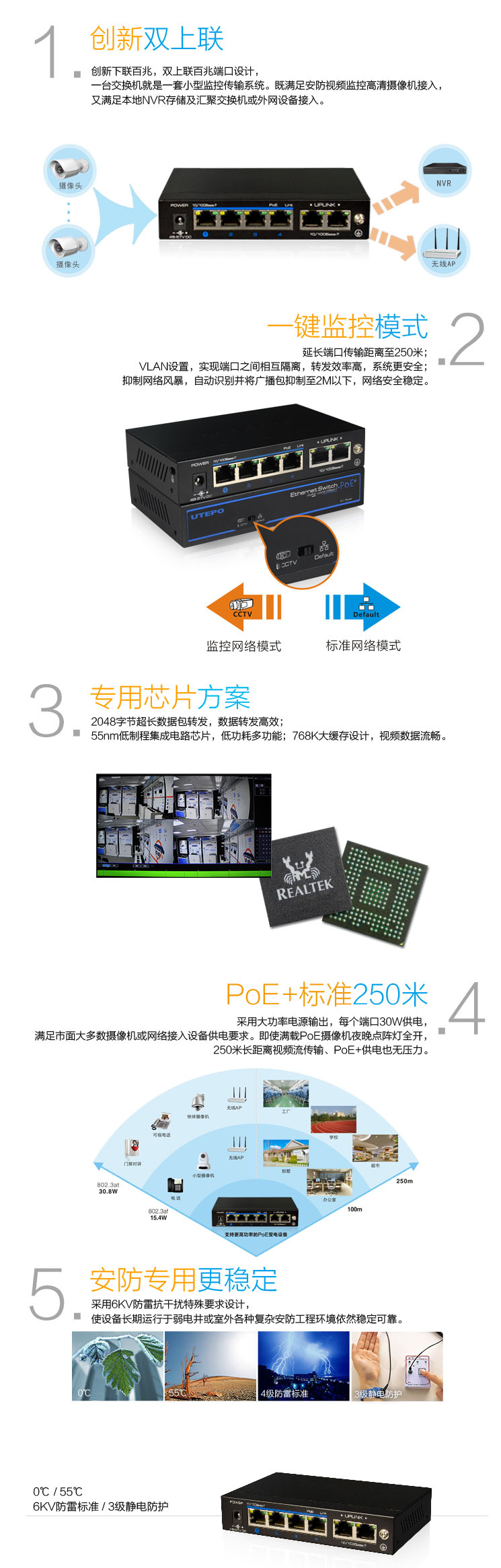 該系列交換機所有下聯(lián)以太網(wǎng)RJ-45端口均支持以太網(wǎng)供電(PoE +),每個端口可提供高達30W的功率,符合IEEE 802.3af/at標準。 該系列交換機支持一鍵CCTV功能,可廣泛用于視頻安全監(jiān)控系統(tǒng)及網(wǎng)絡(luò)項目中。